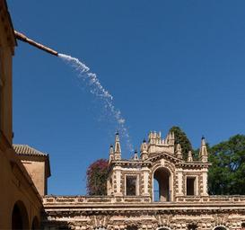 Keywords: seville spain buildings spigot water skyline sky clouds trees outside city cities urban flowing summer spring architecture