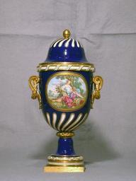 | Keywords: Sèvres Porcelain Manufactory - One of a Pair of Vases (Vase à feuilles de laurier) - Walters 48626.jpg Walters Art Museum artwork Creator Manufacture nationale de Sèvres This vase and its pair Walters 48 625 are in bleu nouveau and have handles in the form of rings of laurel leaves The vases are decorated with panels showing amorous shepherds and shepherdesses Pithou the elder painted these scenes after Francois Boucher's paintings La Musique pastorale and Les Amusements de la campagne 1743 1772 soft-paste porcelain cm 32 6 accession number 48 626 38481 Collection of Sir Anthony Rothschild according to Hodgkins remains to be verified E M Hodgkins Collection Paris no 51 date and mode of acquisition unknown A Seligmann Rey and Co New York Henry Walters city Baltimore Walters Art Museum Henry Walters Acquired by Henry Walters 1928 Factory Mark Intertwined Lls; Date Letters T 1772 ; Modeler's Mark Incised in the glaze PT initials could refer to either Pierre-Edmond Tristant aîné c 1741-1788 a turner repairer and sculptor of soft and hard paste; or Philibert Choulet aîné op 1756-1779 a turner and possibly repairer of soft and hard paste place of origin Sèvres France Walters Art Museum license Sèvres porcelain in the Walters Art Museum Charles-Nicolas Dodin Nicolas-Pierre Pithou |