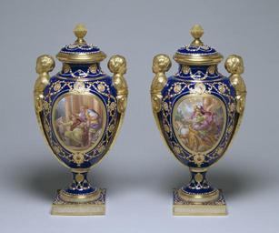 | Keywords: Sèvres Porcelain Manufactory - Pair of Vases - Walters 48566, 48567 - Group.jpg Between 1778 and 1782 Sèvres manufactured for Louis XVI a series of vases with handles shaped as busts of infants young women and old men hence the name vases des ges The Walters' examples with the infants and a bleu nouveau ground color bear classical scenes and an additional decoration of jewels composed of enamel drops over gold foil The classical scenes are derived from an illustrated edition of Télémaque a romance set in antiquity written by Fénélon in 1699 These vases show Telemachus the son of Ulysses winning a chariot race and Minerva disguised as an old man persuading Telemachus to participate in a war against the Dauniens These vases were designed by Jacques-François Deparis The painting was by Antoine Caton the gilding by Etienne-Henry Le Guay and the jewels by Philippe Parpette ca 1778 soft-paste porcelain with gilt and enamel cm 35 5 accession number 48 566 48 567 77457 Louis XVI Chateau de Versailles November 2 1781 by purchase from Sèvres factory Rothchild Collection date and mode of acquisition unknown not verified Collection Park Heirlooms date and mode of acquisition unknown E M Hodgkins Paris no 69 date and mode of acquisition unknown A Seligmann Rey and Co New York Henry Walters city Baltimore Walters Art Museum Henry Walters Acquired by Henry Walters 1928 Repairer's Mark Incised on the inside of the rim B Bono Étienne Henri répareur ; Gilder's Mark Le Guay Etienne Henry place of origin Sèvres France Walters Art Museum license Sèvres porcelain in the Walters Art Museum Media contributed by the Walters Art Museum needs category review Media contributed by the Walters Art Museum needs artist review Gilded vases |