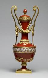 | Keywords: Sèvres Porcelain Manufactory - Two-Handled Vase - Walters 48754.jpg This unusual red vase is part of a suite of three that Louis XVI purchased in the Porcelain Dining Room at Versailles in December 1782 for 6 000 livres The ormolu mounts are attributed to Jean-Claude Duplessis fils 1730-1783 1782 soft-paste porcelain with gilt-bronze mounts cm 54 7 accession number 48 754 19891 Collection of Louis XVI King of France Chateau de Versailles King's Apartment December 1782 by purchase from the maker at the annual Sèvres Manufactory exhibition Philippe Sichel Paris date and mode of acquisition unknown William T / Henry Walters Collection Baltimore November 25 1891 by purchase Walters Art Museum Henry Walters Acquired by William T or Henry Walters 1891 Visible marks Factory Mark Intertwined Lls with crown above and flower mark below in gold; Date Letters EE 1782 ; Date Letter Color Gold; Modeler's Mark Flower mark attributed to Nicolas Schradre Splendors of Versailles Mississippi Arts Pavilion Jackson 1998 place of origin Sèvres France Walters Art Museum license Sèvres porcelain in the Walters Art Museum Jean-Claude Chambellan Duplessis Charles De Wailly |
