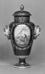 Keywords: Sèvres Porcelain Manufactory - Vase à bandes - Walters 48561.jpg Walters Art Museum artwork Creator Manufacture nationale de Sèvres The satyr-mask handles distinguish this neoclassical vase from a related shape known as vase à bande At Sèvres a plaster model for these shapes is inscribed with the name of the sculptor Etienne-Maurice Falconet 1716-91 but the designer was more likely the director of sculpture at the manufactory Louis-Simon Boizot 1743-1809 Jean-Louis Morin 1731-87 decorated the vases with harbor scenes and Jean Pierre Boulanger père 1722-85 was responsible for the gilding 1776 soft-paste porcelain with paint and gilt cm 42 6 accession number 48 561 5237 Lady Ashburaton Collection E M Hodgkins Collection Paris no 44 date and mode of acquisition unknown A Seligmann Rey and Co New York Henry Walters city Baltimore Walters Art Museum Henry Walters Acquired by Henry Walters 1928 Visible marks Factory Mark Intertwined Lls in blue; Date Letter Y 1776 ; Date Letter Color Blue; Decorator's Mark M Morin Jean-Louis 1732-1787 in blue ; B Boulanger Jean Pierre père 1722-1785 in blue Maryland Heritage European Art at the Time of the Revolution The Walters Art Gallery Baltimore 1976 place of origin Sèvres France Walters Art Museum license Sèvres porcelain in the Walters Art Museum Media contributed by the Walters Art Museum needs artist review Jean-Louis Morin Louis-Simon Boizot Gilded vases