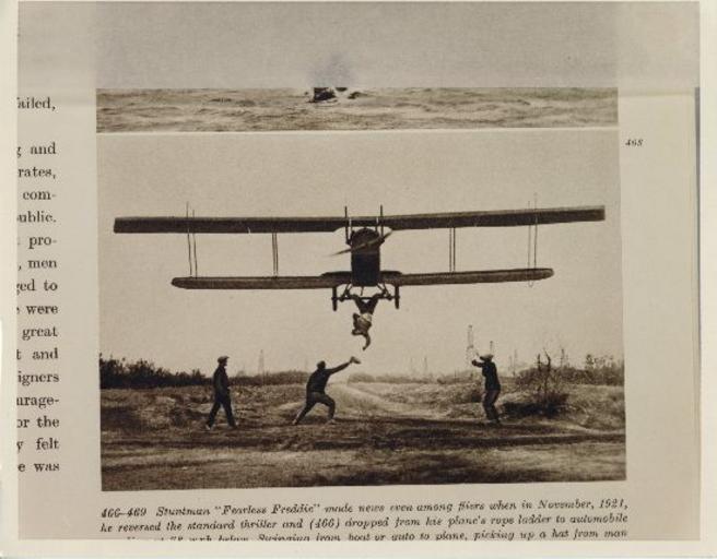 | Keywords: monochrome Catalog #: SF-22 Notes: November 1912 Stunt man "Fearless Freddie" prepares to grab the hat while hanging upside down from a plane. Repository: San Diego Air and Space Museum Archive Catalog #: SF-22 Notes: November 1912 Stunt man "Fearless Freddie" prepares to grab the hat while hanging upside down from a plane. Repository: San Diego Air and Space Museum Archive | ||||