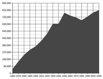 | Keywords: SFPopulation.svg en SF Population Growth 1860-2008 http //www census gov/population/www/documentation/twps0027/tab09 txt 1860 http //www census gov/population/www/documentation/twps0027/tab10 txt 1870 http //www census gov/population/www/documentation/twps0027/tab11 txt 1880 http //www census gov/population/www/documentation/twps0027/tab12 txt 1890 http //www census gov/population/cencounts/ca190090 txt 1900-1990 http //www census gov/popest/counties/tables/CO-EST2008-01-06 xls 2000 and 2008 est Shep See upload date File SFPopulation18602008 png Data used for this image 1860 56802 1870 149473 1880 233959 1890 298997 1900 342782 1910 416912 1920 506676 1930 634394 1940 634536 1950 775357 1960 740316 1970 715674 1980 678974 1990 723959 2000 776733 2008 808976 Demographics of San Francisco |