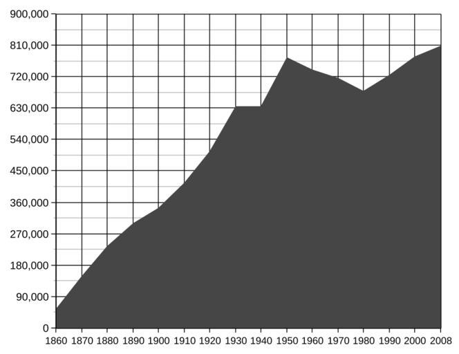 | Keywords: SFPopulation.svg  en SF Population Growth 1860-2008 http //www census gov/population/www/documentation/twps0027/tab09 txt 1860 http //www census gov/population/www/documentation/twps0027/tab10 txt 1870 http //www census gov/population/www/documentation/twps0027/tab11 txt 1880 http //www census gov/population/www/documentation/twps0027/tab12 txt 1890 http //www census gov/population/cencounts/ca190090 txt 1900-1990 http //www census gov/popest/counties/tables/CO-EST2008-01-06 xls 2000 and 2008 est Shep See upload date File SFPopulation18602008 png Data used for this image 1860 56802 1870 149473 1880 233959 1890 298997 1900 342782 1910 416912 1920 506676 1930 634394 1940 634536 1950 775357 1960 740316 1970 715674 1980 678974 1990 723959 2000 776733 2008 808976 Demographics of San Francisco |