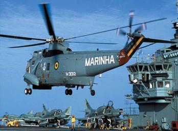 | Keywords: SH-3D Sea King on Brazilian carrier Sao Paulo 2003.jpg A Brazilian Navy Sikorsky SH-3D Sea King landing aboard the aircraft carrier Saõ Paulo A12 in 2003 Note the McDonnell Douglas AF-1 Skyhawk fighters refurbished A-4KU in the background U S Navy Naval Aviation News September-October 2003 http //www history navy mil/nan/backissues/2000s/2003/so03/brazil pdf 2003 USN PD-USGov-Military-Navy H-3 Sea King in service with Brazil A-4 Skyhawk of the Navy of Brazil NAe São Paulo ship 1959 | ||||
