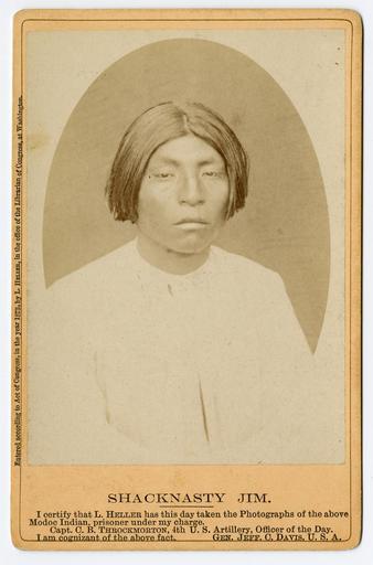 | Keywords: people photo border Repository: California Historical Society Collection: Photographic portraits of Modoc Indians of the Modoc War Photographer: Heller, Louis Herman Date: 1873 General note: Printed on mounts: I certify that L. Heller has this day taken the photographs of the above Modoc Indian prisoner under my charge. Capt. C.B. Throckmorton, 4th U.S. Artillery, Officer of the Day. I am cognizant of the above fact. Gen. Jeff. C. Davis, U.S.A. General note: Photos were published by Carleton E. Watkins. Watkins' Yosemite Art Gallery advertisement on verso. Format: Carte de visite Call Number: PC 006 Digital object ID: PC 006_08.jpg Preferred citation: Shacknasty Jim, Photographic portraits of Modoc Indians of the Modoc War, PC 006, courtesy, California Historical Society, PC 006_08.jpg Repository: California Historical Society Collection: Photographic portraits of Modoc Indians of the Modoc War Photographer: Heller, Louis Herman Date: 1873 General note: Printed on mounts: I certify that L. Heller has this day taken the photographs of the above Modoc Indian prisoner under my charge. Capt. C.B. Throckmorton, 4th U.S. Artillery, Officer of the Day. I am cognizant of the above fact. Gen. Jeff. C. Davis, U.S.A. General note: Photos were published by Carleton E. Watkins. Watkins' Yosemite Art Gallery advertisement on verso. Format: Carte de visite Call Number: PC 006 Digital object ID: PC 006_08.jpg Preferred citation: Shacknasty Jim, Photographic portraits of Modoc Indians of the Modoc War, PC 006, courtesy, California Historical Society, PC 006_08.jpg |