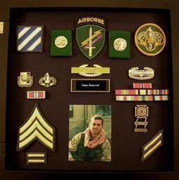 | Keywords: Shadowbox (sterile).JPG Shadow box Top Row 3d Infantry Division 3d ID Former Wartime Service Shoulder Sleeve Insignia / Leadership Tab with U S Identifier / United States Army Civil Affairs Psychological Operations Command USACAPOC Shoulder Sleeve Insignia / Leadership Tab with Psychological Operations Branch Identifier / 3d Armored Cavalry Regiment 3d ACR Former Wartime Service Shoulder Sleeve Insignia / Left 2nd Row Psychological Operations Regimental Crest / 3d Armored Cavalry Regimental Crest / Left 3rd Row Valorous Unit Award / Left 4th Row Sergeant Stripes E-5 / Left 5th Row Overseas Service Bars 2 / Center Combat Cavalry Badge Unofficial / Right 2nd Row Combat Action Badge / Right 3rd Row Ribbon Rack Bronze Star; National Defense; Iraq Campaign; Global War on Terrorism Service ; Army Reserve Mobilized ; Army Service; Overseas Service / Right 4th Row Sharpshooter Rifle; Machine Gun / Right 5th Row Service Stripes 2 2006-07-28 own work by original uploader User Atfyfe Atfyfe Original upload log en wikipedia ftcg page en wikipedia Shadowbox_ sterile JPG wikitable - 18 20 14 August 2006 878 × 887 125 979 bytes Atfyfe w en <nowiki></nowiki> Display cases |