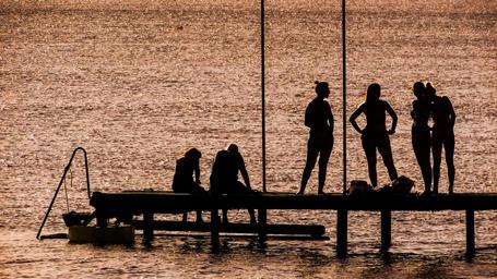 Keywords: shadows people afternoon jetty beach silhouette leisure outdoor relaxation