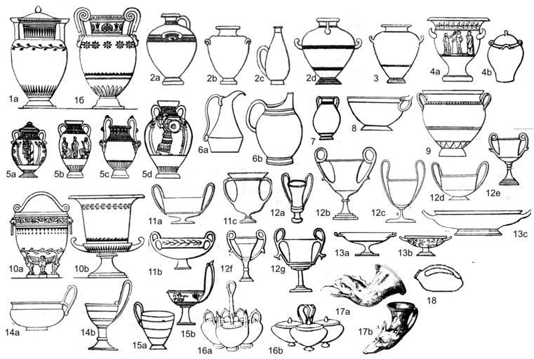 | Keywords: Shapes of ancient greek pottery.jpg  Ceramica greca per forma 1а - cratere a colonnette 1b - cratere a vòlute; 2 - hydria 2a 2b - standard 2c - hydriskos 2d - kalpis ; 3 - stamnos; 4a 4b - krossoi; 5a 5b 5c 5c - anfore panatenaiche; 6a 6b - oinochoi; 7 - pelike 8 - dinos; 9 - kelébe 10a - cratere 10b - cratere a calice; 11a 11b 11c - karcesia 12a 12b 12c 12d 12e 12f 12g - kantharoi; 13a 13b 13c - kylikes; 14a 14b - сotylai; 15a 15b - kyathoi; 16a 16b - kilokes; 17a 17b - rhyta 18 - askos Ancient Greek pottery by shape 1а 1b - amphora; 2 - hydria 2a 2b - standart 2c - hydrisk 2d - konis ; 3 - stamnos 4a 4b - krossos 5 - panathenaic amphorae 6 - oenochoe 7 - pelike 10 - krater 11 - karcesion 12 - kantharos 13 - kylix 14 - сotyla 15 - kyathos 16 - kilox 17 - rhyton 18 - askos 1а 1b - амфо а; 2 - гид ия 2а 2b - обычные 2с - гид иск 2d - конис 3 - cтамнос 4 - к оссос 5 - панафинейские амфо ы 6 - ойнохойя 7 - пелика 8 - лекана 9 - келеб 10 - к ате ы 11 - ка чесион 12 - канфа 13 - килик 14 - котила 15 - киаф 16 - килокс 17 -  итон 18 - аскос Cerámica griega según su forma 1а - crátera de columnas 1b - crátera de volutas; 2 - hidria 2a 2b - estándar 2c - hidrisco 2d - calpis ; 3 - estamno; 4a 4b - crátera de campana; 5a 5b 5c 5c - ánfora panatenaica; 6a 6b - enocoe; 7 - pélice 8 - lecanis; 9 - célebe 10a - crátera 10b - crátera de cáliz; 11a 11b 11c 12a 12b 12c 12d 12e 12f 12g - cántaro; 13a 13b 13c - cílice o cáliz; 14a 14b - сotila; 15a 15b - ciato; 16a 16b - cilox; 17a 17b - ritón 18 - asco Ancient Greek pottery by shape 1а 1b - amphora; 2 - hydria 2a 2b - standart 2c - hydrisk 2d - konis ; 3 - stamnos 4a 4b - krossos 5 - panathenaic amphorae 6 - oenochoe 7 - pelike 10 - krater 11 - karcesion 12 - kantharos 13 - kylix 14 - сotyla 15 - kyathos 16 - kilox 17 - rhyton 18 - askos «History of culture Ancient Greece» Moscow 1903 «Исто ия культу ы на одов ми а Д евняя Г еция» авто Г Вайс Collage own work 2007-10-23 Professor Herman Weis 1822-1897 Ancient Greek pottery by shape Uploaded by Shakko PD-Art  |