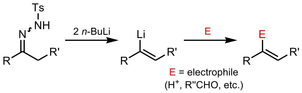 Keywords: Shapiro reaction.svg C - en Scheme of Shapiro reaction ja シャピロ反 の反 式 Own work made with ChemDraw Su-no-G 2008-09-07 Shapiro reaction