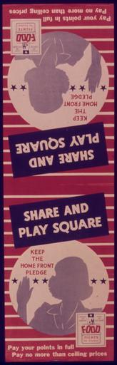 | Keywords: SHARE AND PLAY SQUARE. KEEP THE HOME FRONT PLEDGE. PAY YOUR POINTS IN FULL. PAY NO MORE THAN CEILING PRICES. - NARA - 515393.jpg Scope and content General notes 515393 Local identifier 44-PA-1722A Office for Emergency Management Office of War Information Domestic Operations Branch Bureau of Special Services 03/09/1943 - 09/15/1945 Still Picture Records Section Special Media Archives Services Division NWCS-S National Archives at College Park 8601 Adelphi Road College Park MD 20740-6001 1941 - 1945 Record group Record Group 44 Records of the Office of Government Reports 1932 - 1947 Record group ARC 373 World War II Posters compiled 1942 - 1945 Series ARC 513498 File unit File unit ARC Variant control numbers NAIL Control Number NWDNS-44-PA-1722A Other versions <gallery> File SHARE_AND_PLAY_SQUARE _KEEP_THE_HOME_FRONT_PLEDGE _PAY_YOUR_POINTS_IN_FULL _PAY_NO_MORE_THAN_CEILING_PRICES _-_NARA_-_515393 tif tif File SHARE_AND_PLAY_SQUARE _KEEP_THE_HOME_FRONT_PLEDGE _PAY_YOUR_POINTS_IN_FULL _PAY_NO_MORE_THAN_CEILING_PRICES _-_NARA_-_515393 jpg jpg </gallery> NARA-cooperation PD-USGov World War II posters from the United States |