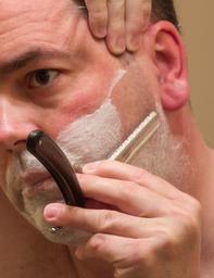 Keywords: Shaving with a Wacker straight razor.jpg en Shaving with a straight razor made by Heribert Wacker Germany 2014-05-11 08 10 16 own Frank Schulenburg cc-zero Uploaded with UploadWizard Straight razors Shaving