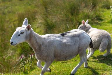 Keywords: sheep flock grass green meadow nature lamb cattle field animal farm landscape agriculture sky blue clouds fields most land wool food environment