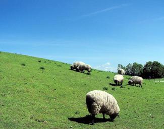 Keywords: sheep germany europe dike meadow grass green white blue animal wool summer sunny coast eat flock nature pasture