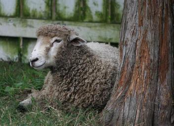Keywords: sheep lamb wool livestock mammal farming domestic flock rural grass tree ewe sitting resting leicester longwool countryside ranch farm outdoors animal