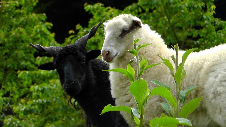 Keywords: sheep ram weis black sheep white sheep wool animal livestock pasture graze two tierhaltung welfare horned togetherness harmony ungulate fur grass paarhufer horns