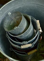 Keywords: sheet metal bucket old stack vessels garden used bucket grey dirty gardening