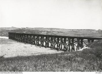 | Keywords: Shellal, Palestine. c. 1916. A wooden railway bridge across a river bed.jpg he גשר ×”×¢×¥ ×ž×¢× × ×—× ×”×‘×©×•×¨ 1916-06-01 AWM-image H12283 author other versions Custom license marker 2015 12 22 PD-Australia Train bridge over Habssor stream Uploaded with UploadWizard |