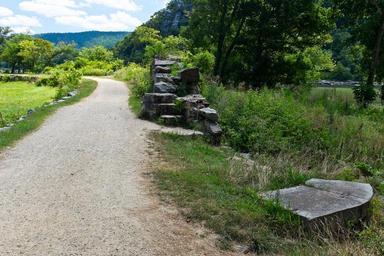 | Keywords: Shenandoah River Lock on Chesapeake and Ohio Canal.jpg en The remains of the Shenandoah River Lock the two stones at the lower right corner on the Chesapeake and Ohio canal at 60 62 miles just below Lock 33 The NPS site http //www hscl cr nps gov/insidenps/report asp STATE PARK CHOH STRUCTURE SORT RECORDNO 384 says This lock was built in 1834 to open the canal to the Potomac River and barges crossing over from the Shenandoah river The lock was built of limestone and was of similar dimension to a typical lock It is located on the river side end of a short run channel branching out from the canal A mule crossover bridge would have been required to pass over the entrance to the channel A ramp was constructed from the towpath up to the vehicular section of the bridge so that mules could cross over the Potomac and stabilize the crossing barges All that remains is a portion of the river wingwall and the river side of the lower gate pocket plus a few traces at the exit from the canal own Bonnachoven Chesapeake Ohio Canal National Historical Park Cc-zero |