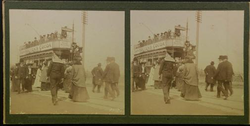 Keywords: There's a clear sign under the Van Houten's Cocoa advert which says "Shepherd's Bush & Hampton Court". Where this is taken though is unknown. One of a set of 19 amateur stereoviews which all appear to date from the very early 1900s mystery amateur identified steroview