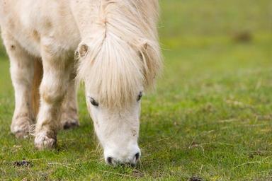 Keywords: shetland pony horse pony white grazing close-up eating grass green photo image equine nature outdoors nobody cute