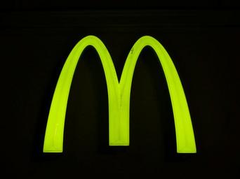 Keywords: shield advertising sign neon sign advertising mcdonalds neon green green neon billboard reklameschild bright logo trademarks lettering m letter
