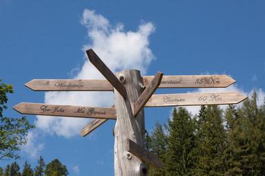 Keywords: shield sign orientation note board wood labeled billboard distance sky blue white cloud