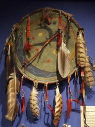 | View Original: | Shield with thunderbird and moon designs, Sioux, late 19th century, hide over wooden hoop with feathers, horse hair, porcupine quills, metal cones - Glenbow Museum - DSC00733.JPG (3648x4861) | |||