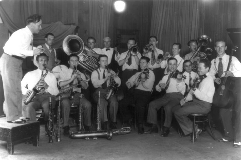 Keywords: Shilkret directing Bain Collection (edited).jpg Victor recording director Nat Shilkret 1889-1982; extreme left conducting a radio or studio group of musicians in the 1920s Back row left to right Joe Green drums three unknown Mike Mosiello trumpet Harry Shilkret trumpet unknown Front row left to right three unknown Lou Raderman violin Pete Eisenberg violin Jack Shilkret piano Benny Posner violin and unknown Source for the majority of the identified musicians Nat Shilkrets's autobiography Sixty years in the music business Lanham Toronto Oxford 2005 Bain News Service photograph via Library of Congress website http //hdl loc gov/loc pnp/cph 3b01329; converted from TIFF to jpg border cropped and slightly changed in contrast before upload Not dated Probably 2nd half of the 1920s Unnamed photographer in employ of Bain News Service PD-Bain Cropped to show only trumpet player Mike Mosiello File Mike Mosiello Bain Collection jpg Nat Shilkret Orchestras from the United States Orchestral recording History of music recording |