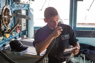| Keywords: Shiloh Sailors honor their history 150407-N-LX437-013.jpg en 150407-N-LX437-013 SOUTH CHINA SEA April 7 2015 Boatswain ™s Mate Seaman Joseph Romano reads an event from the timeline of the Battle of Shiloh on board the Ticonderoga class guided-missile cruiser USS Shiloh ™s CG 67 1MC announcing system as part of a two-day commemoration of the anniversary of the battle during the Civil War The Battle of Shiloh took place April 6 and 7 1862 and was one of the bloodiest battles of American history but is also considered to have been a key strategic victory for Union forces Shiloh is on patrol in the 7th Fleet area of operation supporting security and stability in the Indo-Asia-Pacific region U S Navy Photo by Lt Frederick Martin/Released 2015-04-07 Lt Frederick Martin https //www dvidshub net/image/1861961 150407-N-LX437-013 2015-04-07 21 28 USS SHILOH SOUTH CHINA SEA AT SEA PD-USGov-Military-Navy USS Shiloh CG-67 Images from DoD uploaded by Fæ |