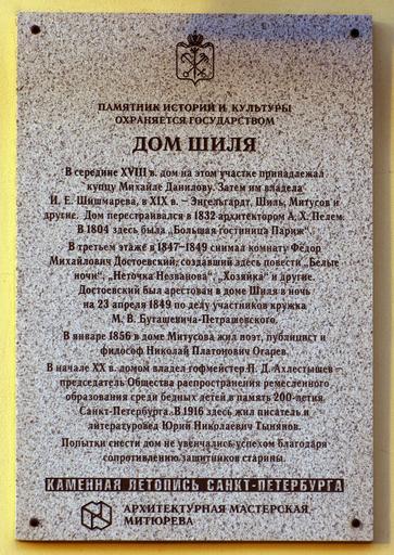 | Keywords: Shilya house Spb.jpg емо иальная доска на доме Шиля в Пете бу ге Вознесенский п оспект 8 алая мо ская 23 Фёдо ихайлович Достоевский ru Ога ёв иколай Платонович ru Тынянов Ю ий иколаевич Shilya house Marble plaques in Saint-Petersburg Fyodor Mikhailovich Dostoevsky en Nikolay Ogarev en Yury Tynyanov Own 2009-01-07 User AKA_MBG/Info AKA MBG Fyodor Dostoyevsky Plaques in Saint Petersburg Malaya Morskaya Street Here-lived plaques in Russia | ||||
