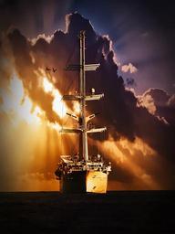 Keywords: ship sailing vessel sea lake water sky clouds sun light sunset lighting painting digital painting