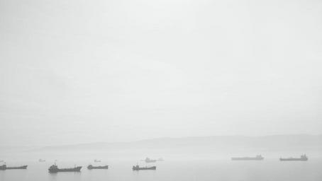 Keywords: ships mist fog boats ocean coast sea mystical morning cloudy clouds black and white grey sky water steam haze