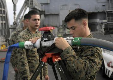 | Keywords: Ships ready with Burma Aid DVIDS90545.jpg en U S Marine Lance Cpl Alex Camargo left and Lance Cpl Michael Dealba connect an intake suction hose to a Tactical Water Purifier System aboard the amphibious ship USS Harpers Ferry LSD 49 The mobile water system can produce up to 1 200 gallons of potable water under ideal conditions Harpers Ferry is part of Joint Task Force Caring Response and is standing by in international waters off the coast of Burma preparing for a humanitarian assistance operation to help victims of Cyclone Nargis 2008-05-23 Chief Petty Officer Michael Kennedy https //www dvidshub net/image/90545 080523-N-+++++-289 2008-05-24 20 59 ANDAMAN SEA PD-USGov-Military-Navy USS Harpers Ferry LSD-49 Images from DoD uploaded by Fæ |