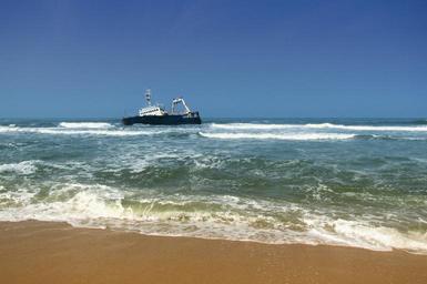 Keywords: shipwreck ocean sea vessel blue boat coast damaged transport water abandoned nautical sand shore waves seascape namibia surf coastal beach coastline horizon