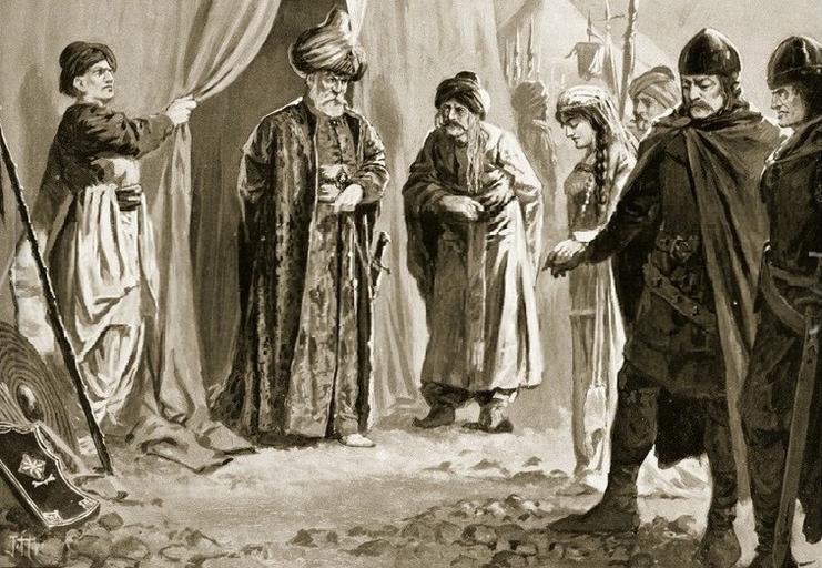 Keywords: Shishman and Murad.jpg en Tsar Shisman and sultan Murad bg Иван Шишман води сест а си в ха ема на у ад own Shukshin John Harris Valda 1874-1942 PD-Art
