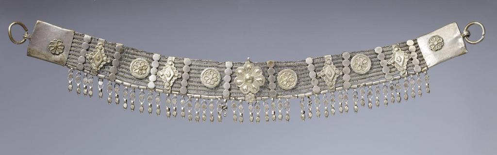 | Keywords: Shm Sharayan - Woman's Headband - Walters 572310.jpg The headband consists of a flexible interlaced silver band with square endpieces each with rosette-shaped knob that fastens the band inside the terminals The band is decorated with a large central rosette in the center which is combined with a smaller rosette and a dangle below Two smaller disk with rosettes on each side of the large central rosette are directly attached to the band In addition between end-pieces discs and the central rosette are four combinations of rhombic elements flanked by slim bars with a five-disc motif each of which is attached to a movable retainer The rhombic elements are decorated with smaller rhombs in the center enclosed by rings and disks The decoration of the attachments is made in filigree technique; the large central rosette is worked in repoussé Hanging down from the band are forty-five multi-element dangles which combine rings disks and small cuboids At the back of one endpiece is a stamp with the Arabic date nusfi 128 7 the term nusfi means half In this year al-Hadi Galib ruled in Sana a' but also Saykh Muhsin b Ali Mu'id It was one year before the second Ottoman occupation of Yemen began On the back of the other end-piece is an engraved Hebrew inscription that names the silversmith Shm uel Sharayan mahasit The term mahasit means half 1287 AH/AD 1870-1871 silver with gilding L 19 1/2 x W of end-pieces 1 1/2 in 49 5 x 3 8 cm accession number 57 2310 80914 Mr Benjamin Zucker Zucker Family Trust and Mr Derek Content New York and London by purchase Walters Art Museum Joint gift to the Walters Art Museum Baltimore and the Israel Museum Jerusalem by Mr Benjamin Zucker and Mr Derek Content in honor of Mrs Barbara Zucker and Mrs Amanda Content 2010 Stamp Arabic nusfi 128 7 AH Engraving Hebrew Sm uel Sarayan mahasit place of origin Raydah Yemen Walters Art Museum license Jewellery in the Walters Art Museum South Arabian art in the Walters Art Museum Shm Sharayan Media contributed by the Walters Art Museum needs category review |