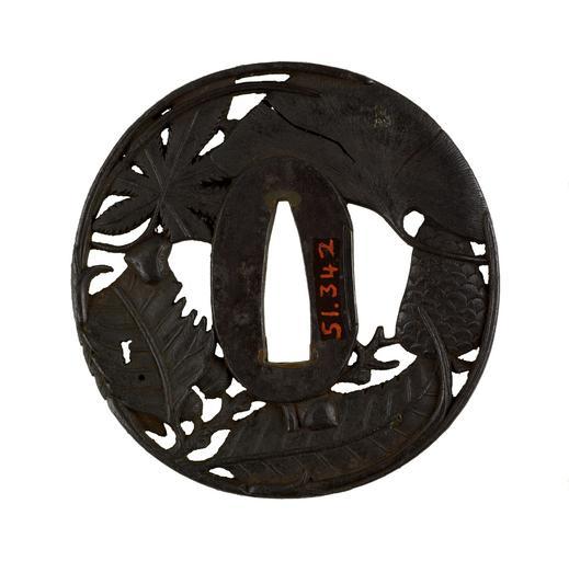 Keywords: Shôami Masakatsu - Tsuba with Autumn Leaves - Walters 51342 - Back.jpg Surrounding the central opening of this tsuba is an openwork design of autumn leaves At the upper right is a maple leaf Two chestnuts leaves fill the lower right and the bottom edge of the tsuba A pine cone and a gingko leaf complete the motif ca 1780 1800 Edo iron gold cm 7 0 5 diam x d accession number 51 342 16289 Henry Walters Baltimore date and mode of acquisition unknown Walters Art Museum Henry Walters Acquired by Henry Walters Transliteration bushû jû/masakatsu saku; Translation Made by Maskatsu residing in Bushû place of origin Edo present-day Tokyo Japan Walters Art Museum license Tsuba in the Walters Art Museum Media contributed by the Walters Art Museum needs category review Tsuba by Shôami Masakatsu |