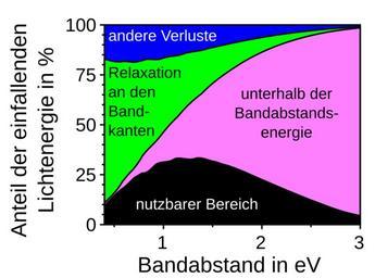 | Keywords: ShockleyQueisserBreakdown2 (DE).svg en The Shockley-Queisser limit for the maximum possible efficiency of a solar cell black and the inevitable losses that limit it other colors The black height is energy that can be extracted as useful electrical power; the pink height is energy of below-bandgap photons; the green height is energy lost when hot photogenerated electrons and holes relax to the band edges; the blue height is energy lost in the tradeoff between low radiative recombination versus high operating voltage The curves are all wiggly because of IR absorption bands in the atmosphere I used the actual AM1 5G solar spectrum data I cross-checked the black curve with independently-calculated ones and they agree to high accuracy see blelow The other curves besides the black curve are not published in exactly this form to my knowledge but it's a straightforward part of the same calculation E Yablonovitch and O Miller The Influence of the 4n<sup>2</sup>Light Trapping Factor on Ultimate Solar Cell Efficiency in Optics for Solar Energy OSA Technical Digest CD Optical Society of America 2010 paper SWA1 http //www opticsinfobase org/abstract cfm URI OSE-2010-SWA1 Y Zhang D Ding S R Johnson and S H Lim A Semi-Analytical Model and Characterization Techniques for Concentrated Photovoltaic Multijunction Solar Cells in Optics for Solar Energy OSA Technical Digest CD Optical Society of America 2010 paper SWC4 http //www opticsinfobase org/abstract cfm URI OSE-2010-SWC4 de Die Shockley-Queisser-Grenze schwarz für den maximal möglichen Wirkungsgrad einer Solarzelle und weitere unvermeidliche Verluste andere Farben die den Wirkungsgrad begrenzen Der schwarze Bereich kennzeichnet den für die Energieumwandlung nutzbaren Bereich der rosafarbene Bereich die Photenen mit einer Energie unterhalb der Bandabstandsenergie der grüne Bereich Energieverluste durch heiße photogenerierten Elektronen und Löcher die an den Bandkanten relaxieren und der blaue Bereich Energieverluste die durch den notwendigen Kompromiss zwischen niedrig strahlenden Rekombinationen und einer hohen Betriebsspannung entstehen Die schwarze Kurve ist etwas wacklig aufgrund von Einflüssen durch IR-Absorptionsbanden in der Atmosphäre hierbei wurden die tatsächlichen Daten AM1 5G-Sonnenspektrum genutzt Manchmal wird dieses Spektrum durch ein 6000-K-Schwarzkörperspektrum angenähert In diesem Fall erhält man eine glattere Kurve mit leicht unterschiedlichen Werten Die hier gezeigte Darstellung wurde mit unabhängigen Darstellungen aus anderen Quellen siehe unten verglichen und zeigen einer hohe à bereinstimmung Die anderen Kurven wurden in dieser Form noch nicht veröffentlicht sind aber Teil der gleichen Berechnung E Yablonovitch and O Miller The Influence of the 4n<sup>2</sup>Light Trapping Factor on Ultimate Solar Cell Efficiency in Optics for Solar Energy OSA Technical Digest CD Optical Society of America 2010 paper SWA1 http //www opticsinfobase org/abstract cfm URI OSE-2010-SWA1 Y Zhang D Ding S R Johnson and S H Lim A Semi-Analytical Model and Characterization Techniques for Concentrated Photovoltaic Multijunction Solar Cells in Optics for Solar Energy OSA Technical Digest CD Optical Society of America 2010 paper SWC4 http //www opticsinfobase org/abstract cfm URI OSE-2010-SWC4 ShockleyQueisserBreakdown2 svg 2011-12-11 10 54 UTC ShockleyQueisserBreakdown2 svg Sbyrnes321 derivative work Cepheiden <span class signature-talk >talk</span> translation; point reduction Cepheiden ShockleyQueisserBreakdown2 svg Cc-zero Original upload log This image is a derivative work of the following images File ShockleyQueisserBreakdown2 svg licensed with Cc-zero 2011-02-17T23 11 13Z Sbyrnes321 969x720 108258 Bytes <nowiki> en The Shockley-Queisser limit for the maximum possible efficiency of a solar cell black and the inevitable losses that limit it other colors The black height is energy that can be ext</nowiki> Uploaded with derivativeFX Photovoltaic power schemas and diagrams Solar cell schemas and diagrams |