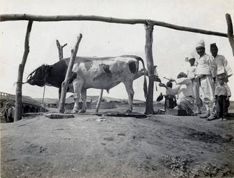 | Keywords: Shoeing a bullock, Korea, (s.d.) (Taylor box21num14).jpg en <br> Shoeing a bullock Korea s d Bullocks are shod to protect their hooves on rough roads This method is peculiar to eastern Asia Horses and donkeys are handled the same way The animal is securely fastened in a sling as shown here or it may be thrown on the the ground and its feet tied before the blacksmith attempts to shoe it Date created 1908/1922 Publisher of the Digital Version University of Southern California Libraries Repository Name Methodist Church U S Legacy Record ID kda-m81 Photographer Methodist Episcopal Church Format photograph Archival file kda_Volume42/Taylor_box21num14 jpg Rights Neither the General Conference nor any General Agency of The United Methodist Church successor to the Methodist Episcopal Church claims any interest in the photos or images Filename Taylor_box21num14 Coverage date 1908/1922 Contributing entity University of Southern California Repository Address Nashville Tennessee Part of collection Korean Digital Archive Donor Taylor Ewing Bevard Type images Part of subcollection The Reverend Corwin Nellie Taylor Collection Geographic Subject Country Korea Compiler Taylor Corwin; Blood-Taylor Nellie 1908/1922 Methodist Episcopal Church http //digitallibrary usc edu/cdm/ref/collection/p15799coll48/id/712 PD-Japan-oldphoto Korean archive in the USC digital library Images from USC Digital Library uploaded by Fæ |