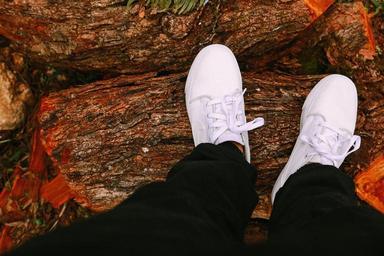 Keywords: shoes feet white clean new footwear fashion outdoors trunk standing ground bark sneakers shiny lifestyle