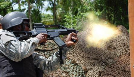 | Keywords: Shooters Put Rounds Downrange During Three Days of Marksmanship Events at Fuerzas Comando Image 8 of 8.jpg A soldier from the Trinidad and Tobago Special Operations team fires his weapon during the critical skills evaluation exercises June 18 at the Dominican Army's 1st Infantry Brigade in Santo Domingo The troop is competing in Fuerzas Comando 2010 an annual Special Operations competition sponsored by the United States Southern Command and hosted by the Dominican military http //www dvidshub net/image/292128/shooters-put-rounds-downrange-during-three-days-marksmanship-events-fuerzas-comando 2010-06-18 Isidro Almonte PD-USGov Fuerzas Comando 2010 Special forces of Trinidad and Tobago People with HK G36 |