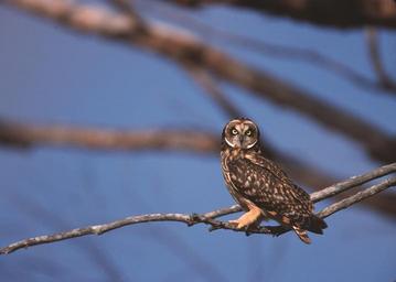 Keywords: short eared owl bird portrait sitting wildlife predator nature outdoors perched branch looking feathers beak tree limb