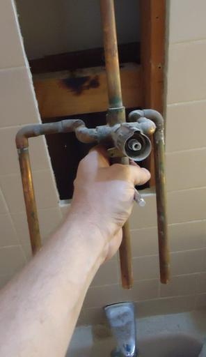 Keywords: Shower project old diverter valve with pipes removed.jpg en A handyman project to redo pipes behind the shower Here the water was shut off pipes were cut and the old diverter valve assembly is being removed 2012-08-16 own Tomwsulcer cc-zero Uploaded with UploadWizard Handyman photos by tom sulcer Plumbing |