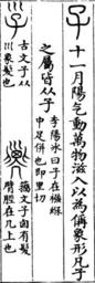 | Keywords: Shuowen-子.png en Entry for the character 子 zǐ child from chapter 15 of the Shuowen Jiezi an ancient Chinese character dictionary This entry shows three pre-Han forms of the character the small seal form top right ancient script form top left and Zhòuwén form middle left Qiu Xigui 裘锡 2000 Chinese Writing English translation of 文字學概論 by Gilbert L Mattos and Jerry Norman Early China Special Monograph Series No 4 Berkeley The Society for the Study of Early China and the Institute of East Asian Studies University of California Berkeley ISBN 978-1-55729-071-7 page 73 2016-02-20 https //archive org/details/06081963 cn Shuowen Jiezi chapters 14 15 page 78 scan of Siku Quanshu Huiyao at the Internet Archive Xu Shen 1st century Xu Xuan 10th century other versions PD-old-70-1923 Shuowen Jiezi Seal script Siku Quanshu |