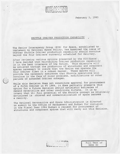 Keywords: Shuttle Orbiter Production Capability - NARA - 198230.tif Scope and content General notes 198230 Local identifier President 1981-1989 Reagan National Security Council 1981 - 1989 Ronald Reagan Library NLRR 40 Presidential Drive Simi Valley CA 93065-0600 1983-02-03 Record group Collection RR-NSC Numbered National Security Policy Papers 1981 - 1989 Record group ARC 1189 National Security Decision Directives compiled 02/25/1981 - 01/19/1989 Series ARC 198166 File unit File unit ARC Variant control numbers NAIL Control Number NLS-NSC-NSDD-80 yes Other versions <gallery> File Shuttle_Orbiter_Production_Capability_-_NARA_-_198230 tif tif File Shuttle_Orbiter_Production_Capability_-_NARA_-_198230 jpg jpg </gallery> NARA-cooperation PD-USGov Presidential Decision Directives Reagan NARA TIF images with categorized JPGs |