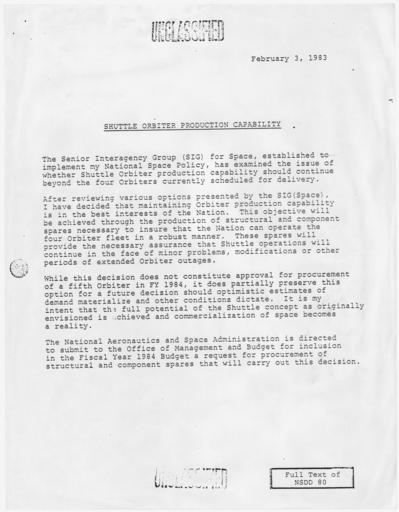 Keywords: Shuttle Orbiter Production Capability - NARA - 198230.jpg Scope and content General notes 198230 Local identifier President 1981-1989 Reagan National Security Council 1981 - 1989 Ronald Reagan Library NLRR 40 Presidential Drive Simi Valley CA 93065-0600 1983-02-03 Record group Collection RR-NSC Numbered National Security Policy Papers 1981 - 1989 Record group ARC 1189 National Security Decision Directives compiled 02/25/1981 - 01/19/1989 Series ARC 198166 File unit File unit ARC Variant control numbers NAIL Control Number NLS-NSC-NSDD-80 Other versions <gallery> File Shuttle_Orbiter_Production_Capability_-_NARA_-_198230 tif tif File Shuttle_Orbiter_Production_Capability_-_NARA_-_198230 jpg jpg </gallery> NARA-cooperation PD-USGov Presidential Decision Directives Reagan |