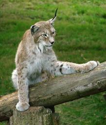 Keywords: siberian lynx big cat wildlife feline nature zoo sitting portrait stump wood large carnivore mammal fur