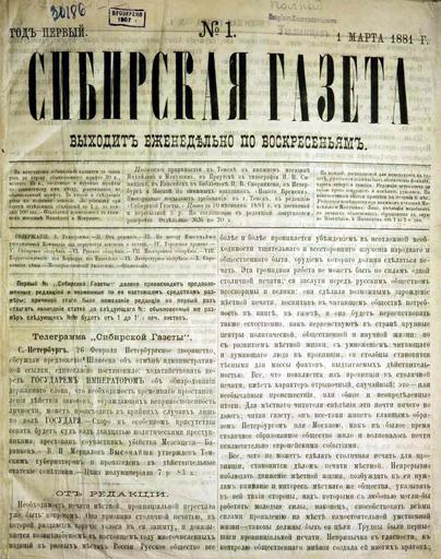 Keywords: Sibirskaya gazeta.jpg en Sibirskaya gazeta - 1st page of 1st issue ru Сиби ская газета пе вая ст аница пе вого выпуска 1881-03-01 sun tsu ru/mminfo/000351029/1881/1 1 march djvu Sibirskaya gazeta PD-old-100 Uploaded with UploadWizard History of Tomsk Newspapers of Russia 1881 Newspaper front pages Media of Tomsk Newspapers of Russia to be categorised by name |