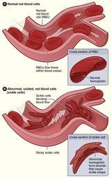 | Keywords: Sickle cell 01.jpg en Figure A shows normal red blood cells flowing freely in a blood vessel The inset image shows a cross-section of a normal red blood cell with normal hemoglobin Figure B shows abnormal sickled red blood cells blocking blood flow in a blood vessel The inset image shows a cross-section of a sickle cell with abnormal sickle hemoglobin forming abnormal strands http //www nhlbi nih gov/health/health-topics/topics/sca/ The National Heart Lung and Blood Institute NHLBI Last revised February 01 2011 Information media from U S Department of Health Human Services PD-USGov Red blood cells Sickle-cell anemia Hemoglobin beta-chain |